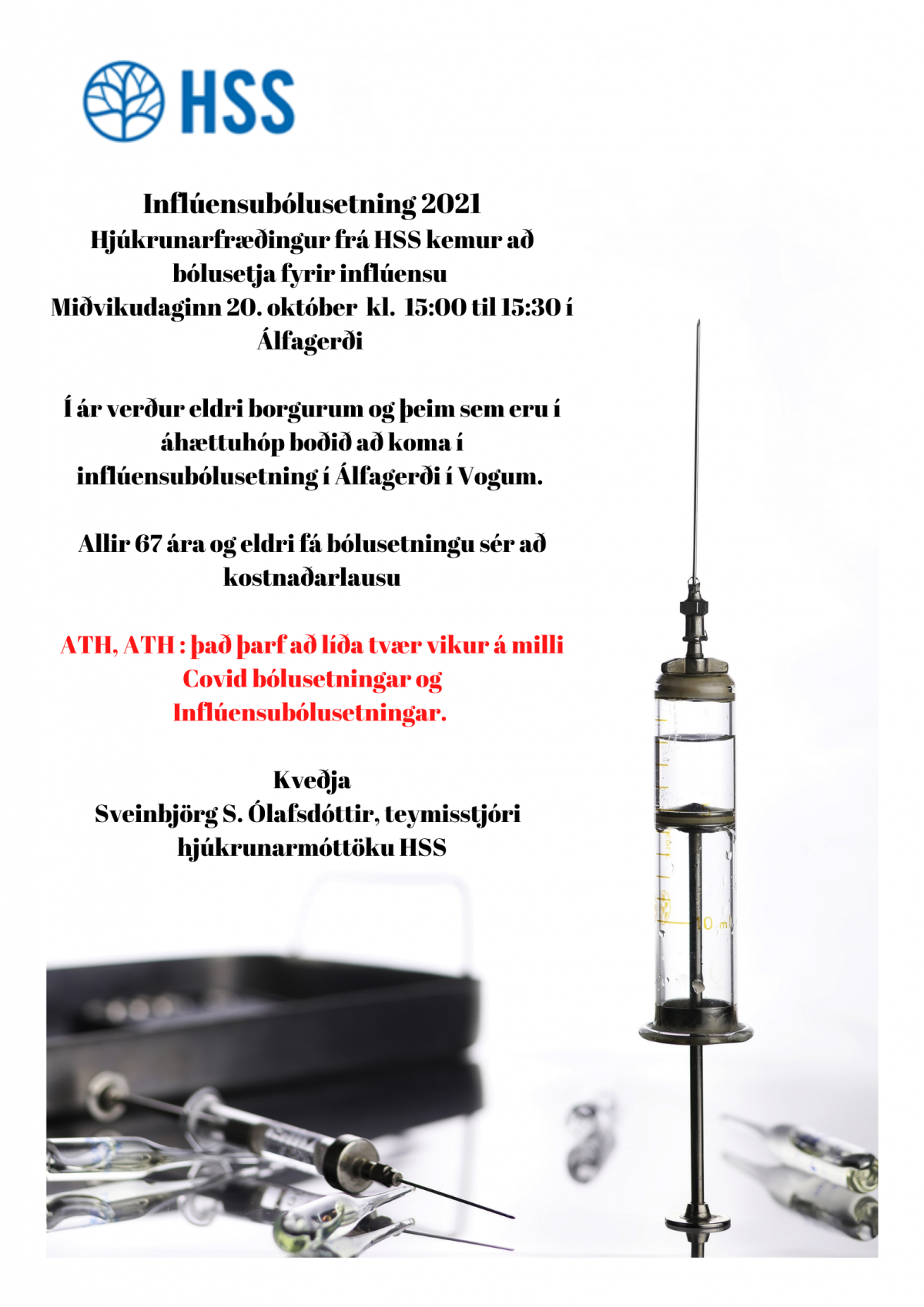 Í ár verður eldri borgurum og þeim sem eru í áhættuhóp boðið að koma í inflúensubólusetning í Álfagerði í Vogum.