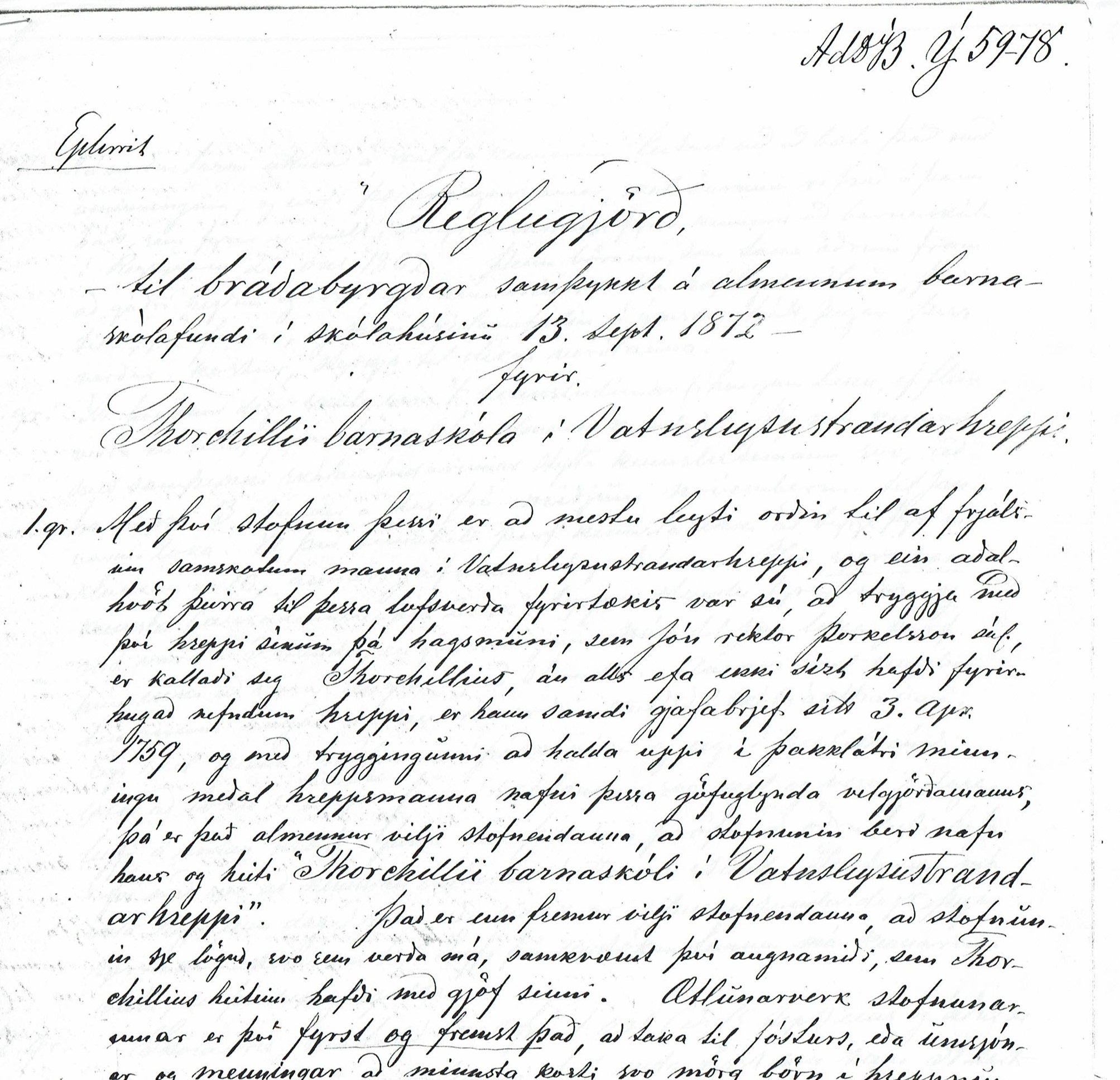 Skólinn okkar, sem í upphafi hét Thorkillii barnaskólinn í Vatnsleysustrandarhreppi, var stofnaður í nýbyggðu skólahúsi af samnefndu félagi haustið 1872 af frumkvæði séra Stefáns Thorarensen prests og sálmafrumkvöðuls á Kálfatjörn.
