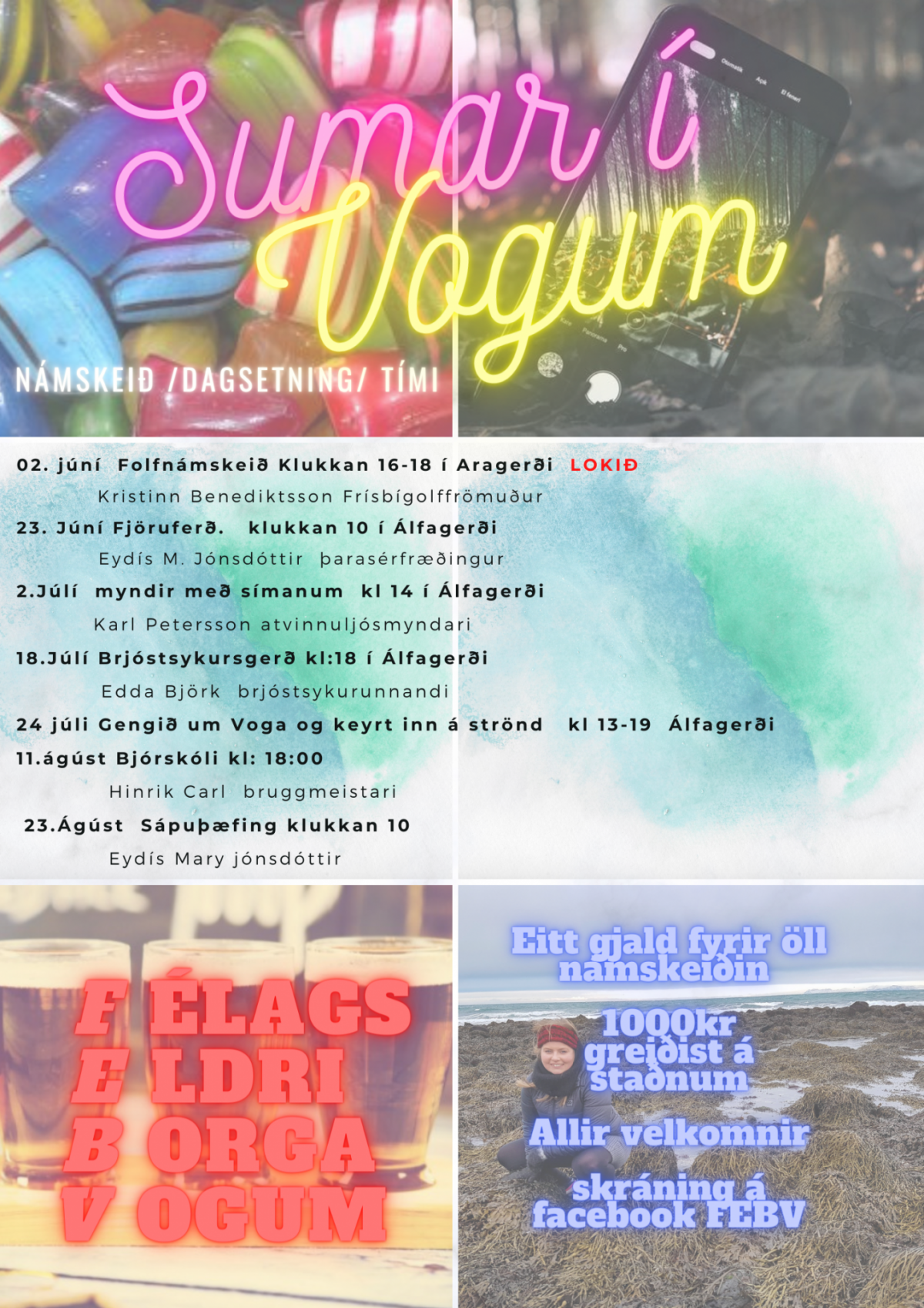 Félag eldri borgara í Vogum stendur fyrir röð fjölbreyttra námskeiða í sumar. Öllum Íbúum Voga er velkomið að mæta en nauðsynlegt er að skrá sig Hér .