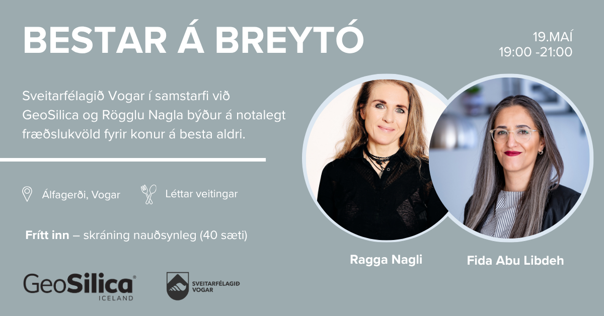 Sveitarfélagið Vogar í samstarfi við GeoSilica og Röggu Nagla býður á notalegt fræðslukvöld fyrir konur á besta aldri í Álfagerði, Akurgerði 25 þann 19. maí nk.