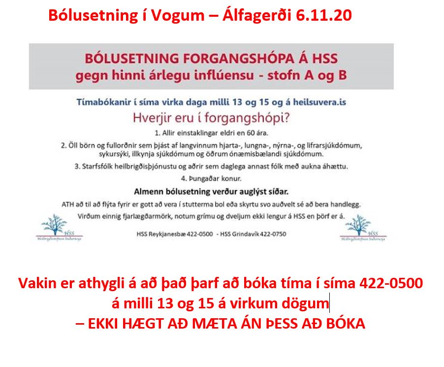 Þann 6. nóvember nk. verður bólusetning fyrir forgangshópa í Vogum og fer hún fram í Álfagerði. Lesið endilega meðfylgjandi auglýsingu og muna að það þarf að panta tíma.
