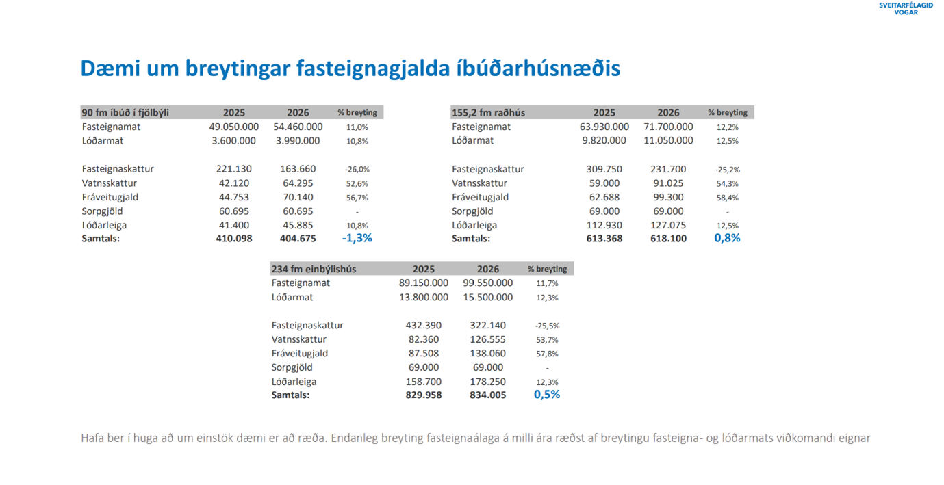 Fyrir íbúa skiptir vitaskuld mestu máli hver heildarálagning er. Í þessu samhengi er vísað til eftirfarandi umfjöllunar í greinargerð með fjárhagsáætlun, þar sem dæmi voru sýnd um breytingar á heildarálögum.
