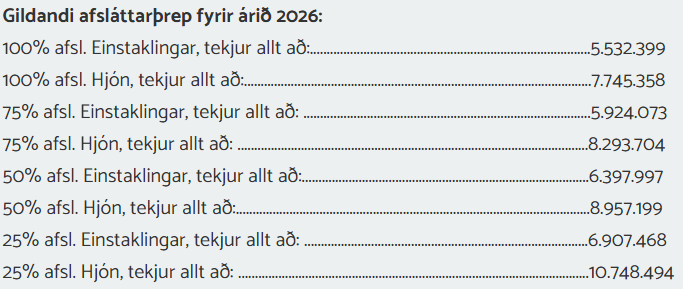 Í upphafi árs 2026 er afsláttur elli- og örorkulífeyrisþega til bráðabirgða miðaður við tekjur ársins 2024. Afslátturinn er endurreiknaður þegar skattframtal 2026 vegna tekna 2025 er staðfest hjá Skattinum. Leiði endurskoðunin til breytinga á afslætti þá skilar breytingin í þær greiðslur sem eftir eru á árinu. Ekki þarf að sækja sérstaklega um afsláttinn.