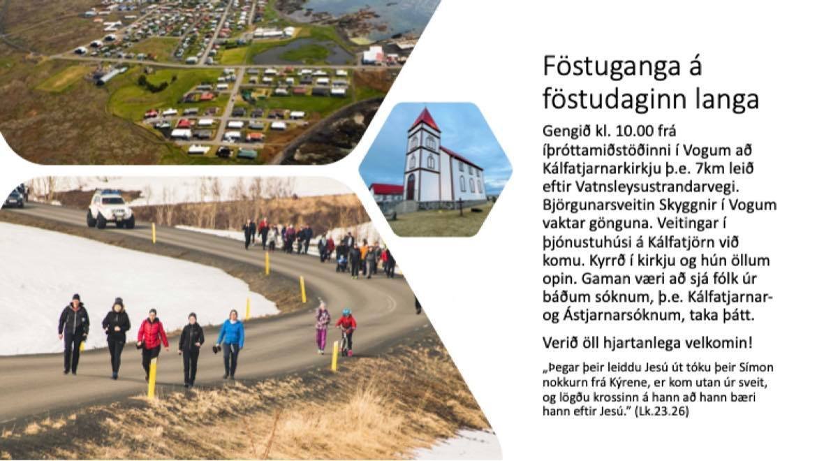 Föstuganga á föstudaginn langa. Um er að ræða hressandi viðburð á vegum Kálfatjarnarsóknar og óskandi að frelsarinn gefi þarna veðrið blítt. Væri gleðilegt ef þetta færi sem víðast og á góðum tíma í loftið og gaman yrði að sjá fólk á öllum aldri ganga saman í Kálftjörn úr Vogum en svo má líka hlaupa, hjóla, keyra. Það má svo margt. Vermandi mótttökur verða alltént á hinum fagra kirkjustað á Vatnsleysuströndinni.