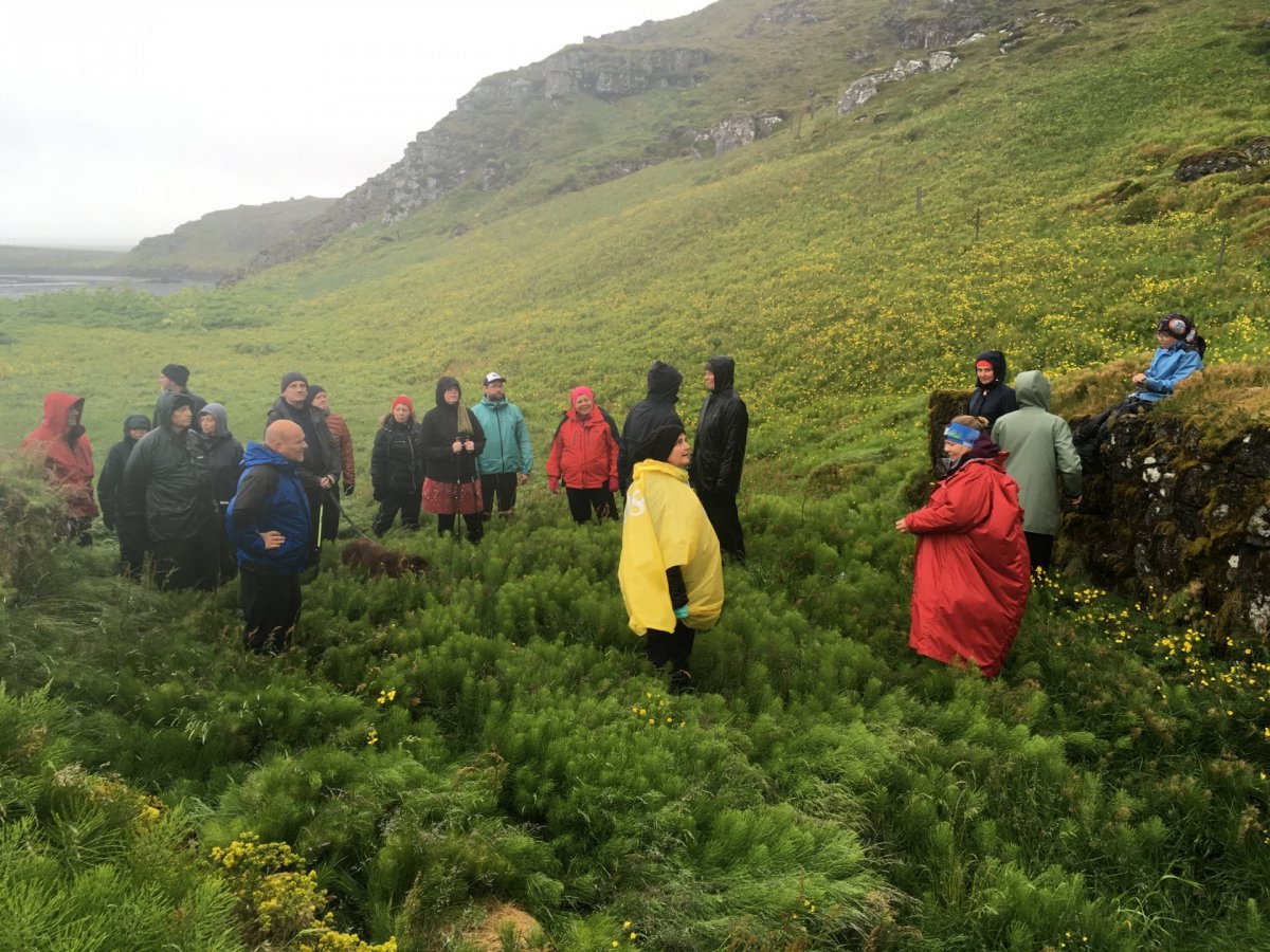 Fimmtudaginn 27. júní efndu Sögu- og minjafélagið í Vogum og Reykjanes UNESCO Global Geopark til gönguferðar í Vogum. Það voru liðlega þrjátíu manns sem mættu og tóku þátt, þrátt fyrir rigningarsudda. Ferðinni var heitið að Brekku undir Vogastapa, þar sem búið var í tæp 100 ár, fram til byrjunar 20. aldar. Gangan hófst við Stóru-Vogaskóla, undir öruggri leiðsögn Hauks Aðalsteinssonar. Á leiðinni var m.a. staldrað við rústir Stóru-Voga, sem talið er að hafi verið fyrsta steinsteypta íbúðarhúsið sem reist var á Suðurnesjum. Áfram var haldið eftir góðum göngustíg sem umlykur byggðina í Vogum, og staldrað næst við upplýsingaskiltið um Sæmundarnef. Þar var drepið á útgerðasögu, einkum árabátaútgerð, sem var fyrirferðamikil í Vogum á öldum áður. Vogavíkin var gjarnan kölluð Gullkistan, svo fengsæl voru fiskimiðin þar. Þá var haldið sem leið liggur eftir fallegri svartri sandfjöru austan við Hvammsgötu. Þar í fjöruborðinu má m.a. sjá leifar af mógröfum. Þessu næst var staldrað við á s.k. Kristjánstanga, sem er innst í Vogavík. Haukur leiðsögumaður sagði þar einnig frá útgerðarsögunni, en á þessum slóðum stóðu m.a. salthús til fiskverkunar á 19. öld. Áfram var haldið og stefnan nú tekin að Brekku undir Vogastapa. Háfjara var, sem gerði hópnum kleift að ganga á sléttum sandbotninum, í stað þess að klöngrast eftir þýfðu landslagi í brekkurótunum. Í sandinum mátti sjá litla hrauka, sem eru eftir fjörumaðka sem þarna þrífast. Maðkarnir voru fyrr á tímum tíndir og nýttir til beitu á línu. Þessu næst var komið að rústum Brekku, eins þriggja býla þar sem heilsársbúseta var undir Vogastapa. Haukur sagði frá lífi fólksins á þessum slóðum, þegar mest var bjuggu um 30 manns á þessum stað, á þremur býlum. Gengið var um svæðið og rústir fleiri býla skoðaðar, og drepið á útgerðasögunni. Því næst var haldið til baka sömu leið, eftir vel heppnaða ferð. Tveimur tímum eftir brottför komu göngumenn sælir og glaðir til baka að Stóru-Vogaskóla, en eilítið blautir og hraktir. Vel heppnuð ferð í alla staði, og þátttakan góð.