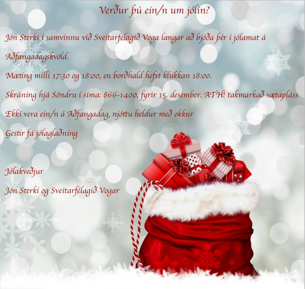 Jólin eru hátíð fyrir flesta, en þó eru þeir til sem af einhverjum ástæðum sjá sér ekki fært að halda þau hátíðleg eða gera sér glaðan dag. Margir eru einir um hátíðarnar og það á enginn að þurfa að vera. Á aðfangadag í ár er fyrirhugað að bjóða þessum einstaklingum í jólakvöldverð á veitingastaðnum Jóni sterka í Vogum. Það er rekstraraðili veitingastaðarins sem sér um viðburðinn í samvinnu við sveitarfélagið. Nánar má fræðast um þetta í meðfylgjandi auglýsingu.