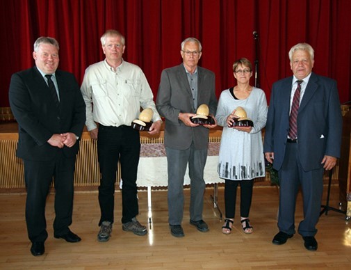 Á myndinni eru umhverfisráðhera, landgræðslustjóri og verðlaunahafarnir. Eiríkur Jónsson, Gýgjarhólskoti, Þorfinnur Þórarinsson, Spóastöðum og Svava Bogadóttir, skólastjóri Stóru-Vogaskóla, hér eru þau með verðlaunagripinn Fjöregg Landgræðslunnar.