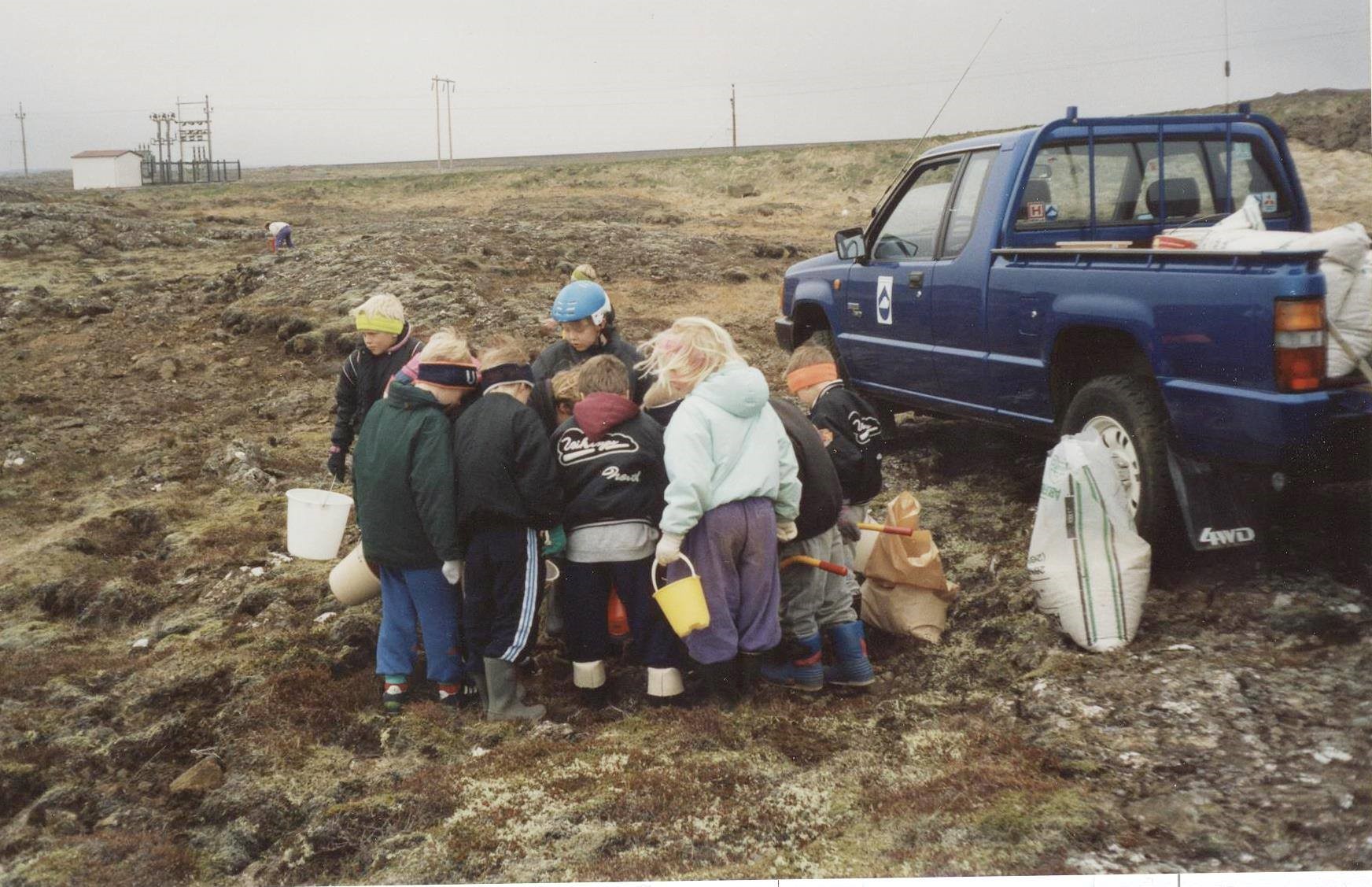 Sáningarhópur vorið 1990, ofan við Vogavík, milli gömlu veganna