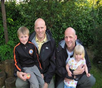 Á neðri myndinni eru göngugarparnir ásamt börnum sínum. Talið frá vinstri til hægri Arnar Egill Hilmarsson, Hilmar Egill Sveinbjörnsson, Gunnar Helgason og Júlía Halldóra Gunnarsdóttir.