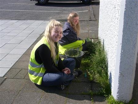 Duglegir og flottir nemendur Vinnuskólans eru að gera fínt í kringum bæjarskrifstofuna við Iðndal 2.