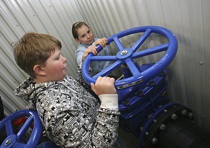 Einar Sindri Einarsson og Sóley Ósk Hafsteinsdóttir nemendur í 6. bekk Stóru- Vogaskóla skrúfuðu frá krananum og hleyptu vatni á lögnina.