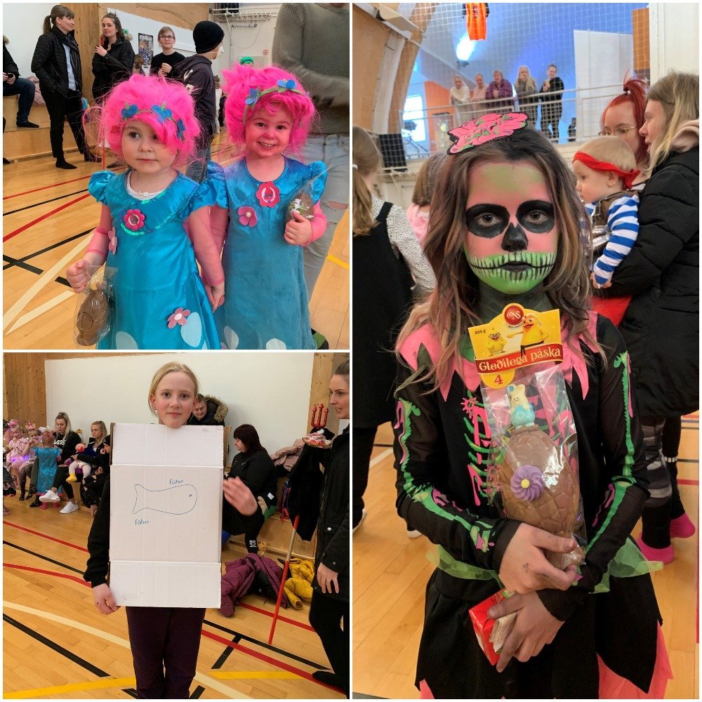 Meðfylgjandi mynd er af þeim þremur sem fengu verðlaun fyrir búninga en veitt voru verðlaun fyrir besta búninginn (til hægri), krúttlegasta búninginn (uppi til vinstri) og frumlegasta búninginn (niðri til vinstri). Fréttaritari síðunnar er því miður ekki alveg með það á hreinu hvað allar þessar stúlkur heita.
