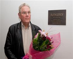 Myndir. Á efri myndinni má sjá Baldur Sigurðsson, höfund nafnsins Álfagerði, við skjöld með nafni hússins.
