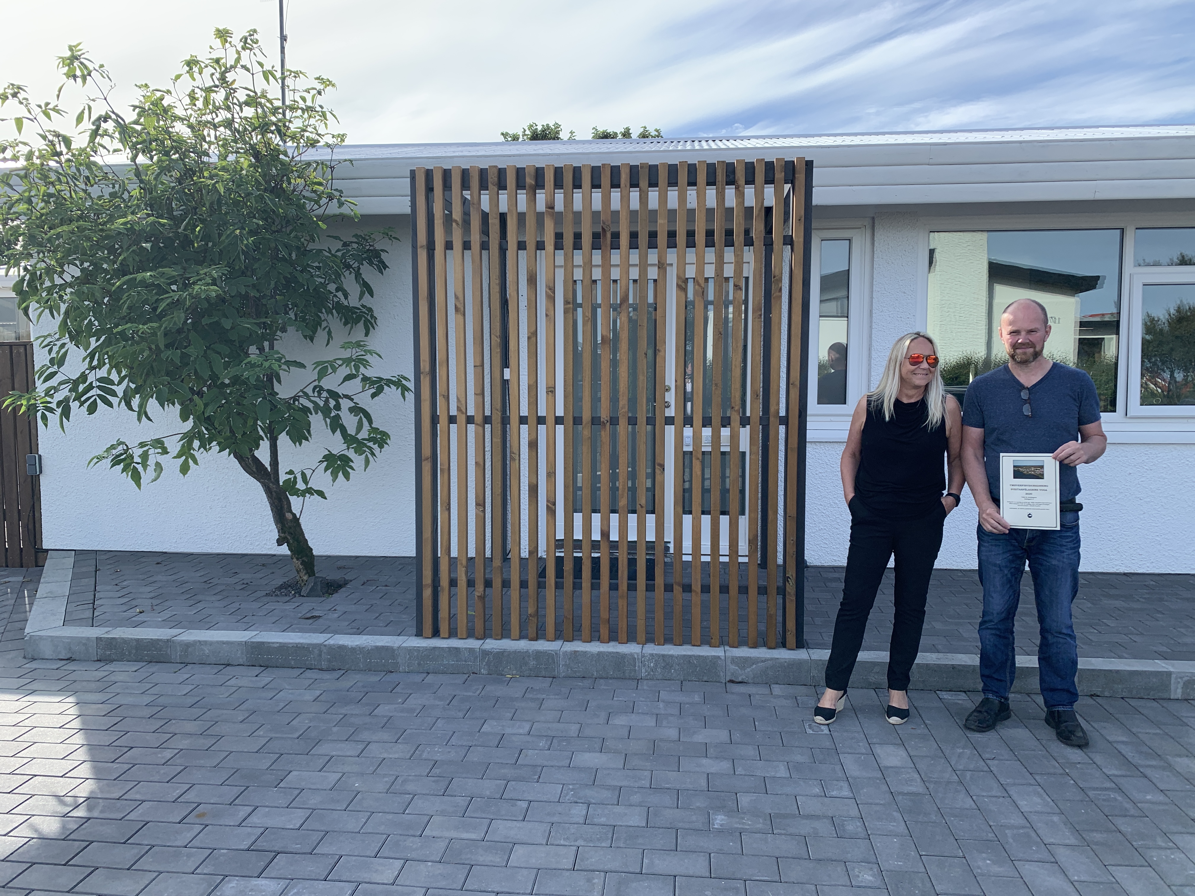 Heiðargerði 18. Valtýr R. Gunnlaugsson og Svava Björg Benediktsdóttir hljóta viðurkenningu fyrir snyrtilega og vel hirta eign. Miklar endurbætur hafa farið fram á lóðinni undanfarin ár þar sem smekklega hefur verið hugað að vistlegum íverustað utandyra, í samspili við gróður.
