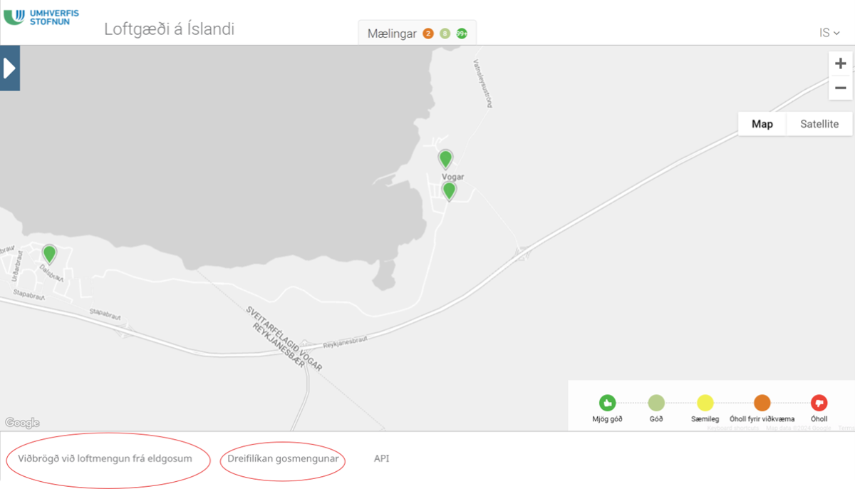 Við hvetjum íbúa eins og áður til að fylgjast með loftgæðum á meðan eldgosi varir á www.loftgaedi.is. Mælarnir tveir sem staðsettir eru í Vogum mæla mismunandi tegundir gosmengunar og því eðlilegt að litakóðarnir sem birtast séu ekki í sama lit. Taka skal mark á þeim mæli sem sýnir verri loftgæði hverju sinni.