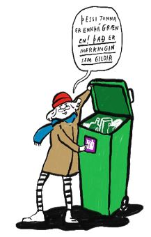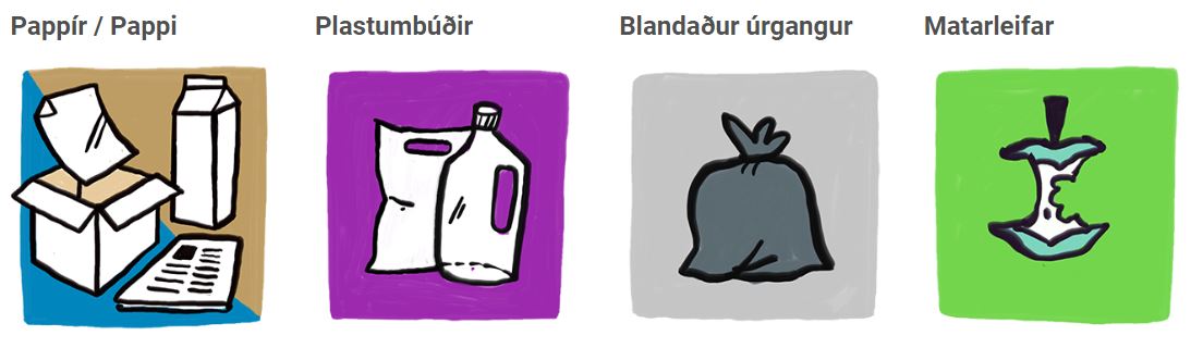Í lögunum sem verið er að innleiða er kveðið á um að allir notist við sömu merkingar fyrir úrgang og því verða allar tunnur merktar með merkingunum sem sjá má hér að ofan. Liturinn á tunnunni skiptir því ekki máli eftir innleiðinguna heldur verður það eingöngu merkingin sem stýrir því hvað fer í hvaða tunnu.